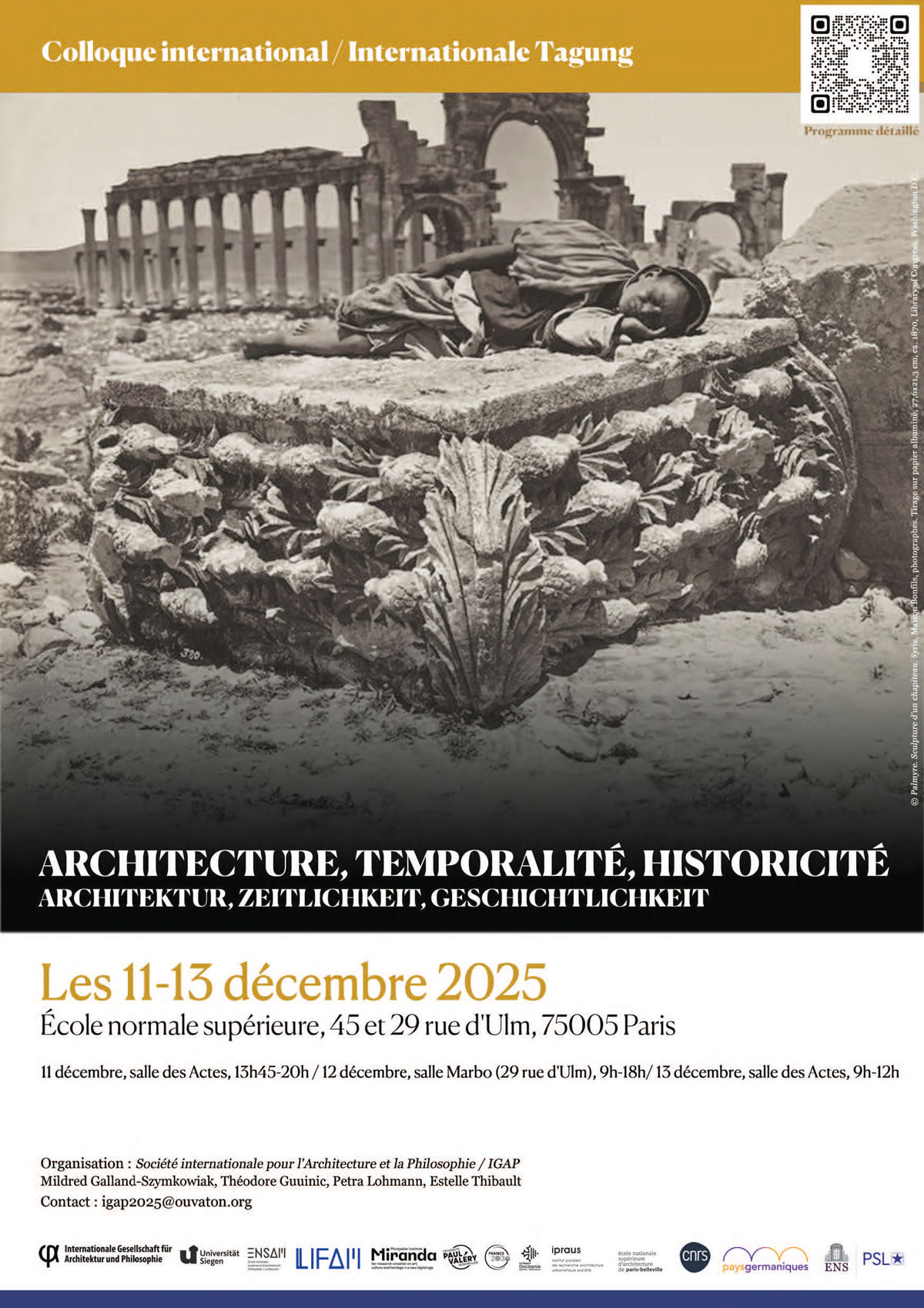 Dans le prolongement des colloques organisés depuis 2012, la Société internationale pour l’architecture et la philosophie (IGAP) organise en décembre 2025 à Paris un colloque international sur le thème « Architecture, temporalité, historicité ».