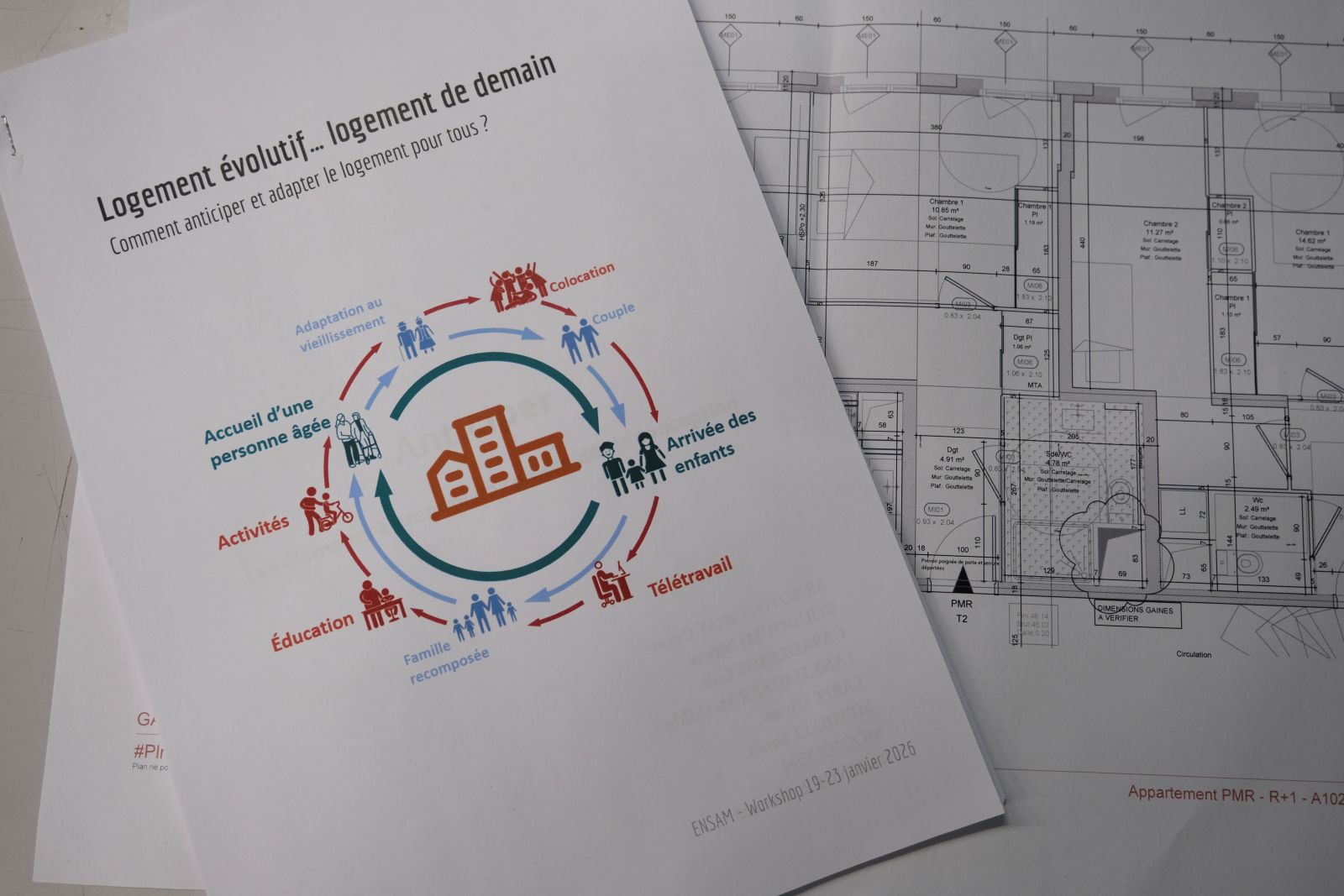 Dans le cadre de l’axe pédagogique Santé globale porté par l’ENSAM, est organisé depuis 2025 un workshop sur le logement évolutif afin de sensibiliser les étudiants à la question de l’accessibilité tout au long de la vie.